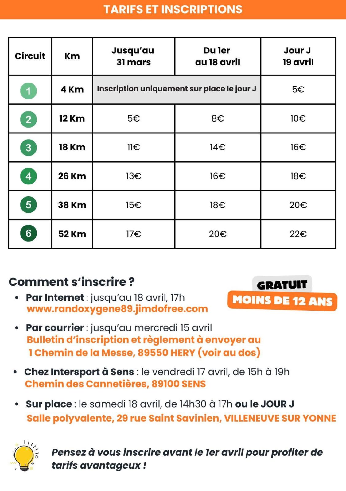 | Normalpreis : 12 km, bis zum 31. März 5€, vom 1. bis zum 18. April 8€, vor Ort 10 €. | 5€ | 10€ |